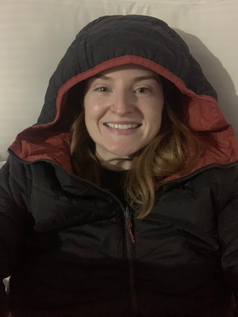 Last night was so cold! Minus 6 when I was going to bed! I added even more layers than the night before, including a hat and gloves! I survived though 🙂