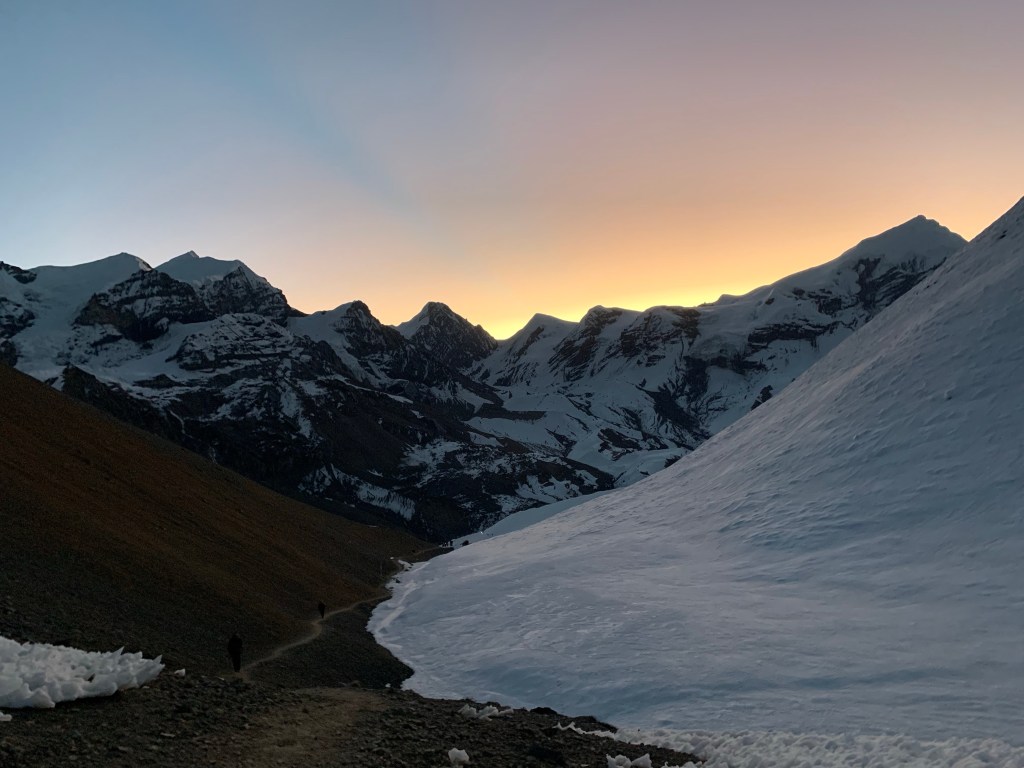 We reached the pass without any trouble, experiencing a beautiful sunrise on the way. At the top, there was a tea house which sits at around 5,000m. Myself and a friend stopped for hot chocolate and a snickers which totalled 1000 rupees (€7.40), which is extortionate for here, but I would have paid double as getting a hot drink at that point was priceless!