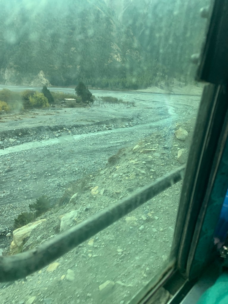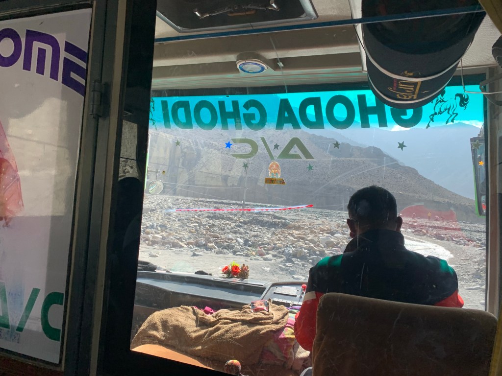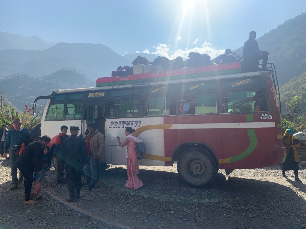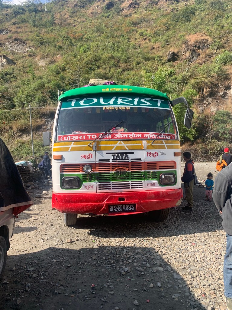 From Marpha, we took another bus to Tatopani, another village in Nepal. This journey was one of the craziest so far. After counting, there were 18 extra people standing on the bus. The door was unable to close and the aisle of the bus was full of local produce that was to be sold in Pokhara.